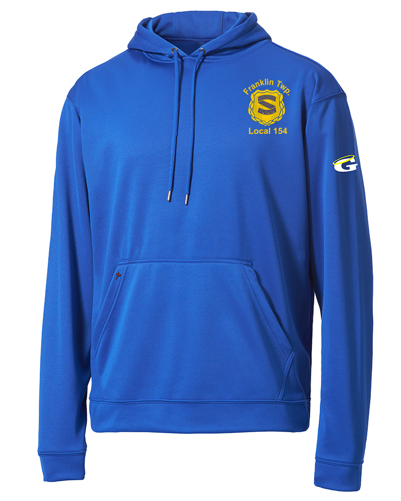 MEN’S TEC HOODED PULLOVER – RELAXED FIT, FRONT POUCH POCKET, 100% MICROFIBER POLYESTER FLEECE, COLOR – NAVY, LOGO LEFT SLEEVE.